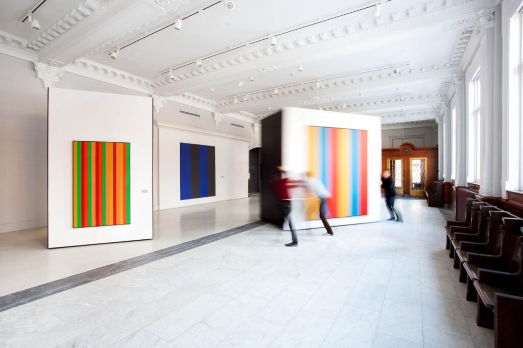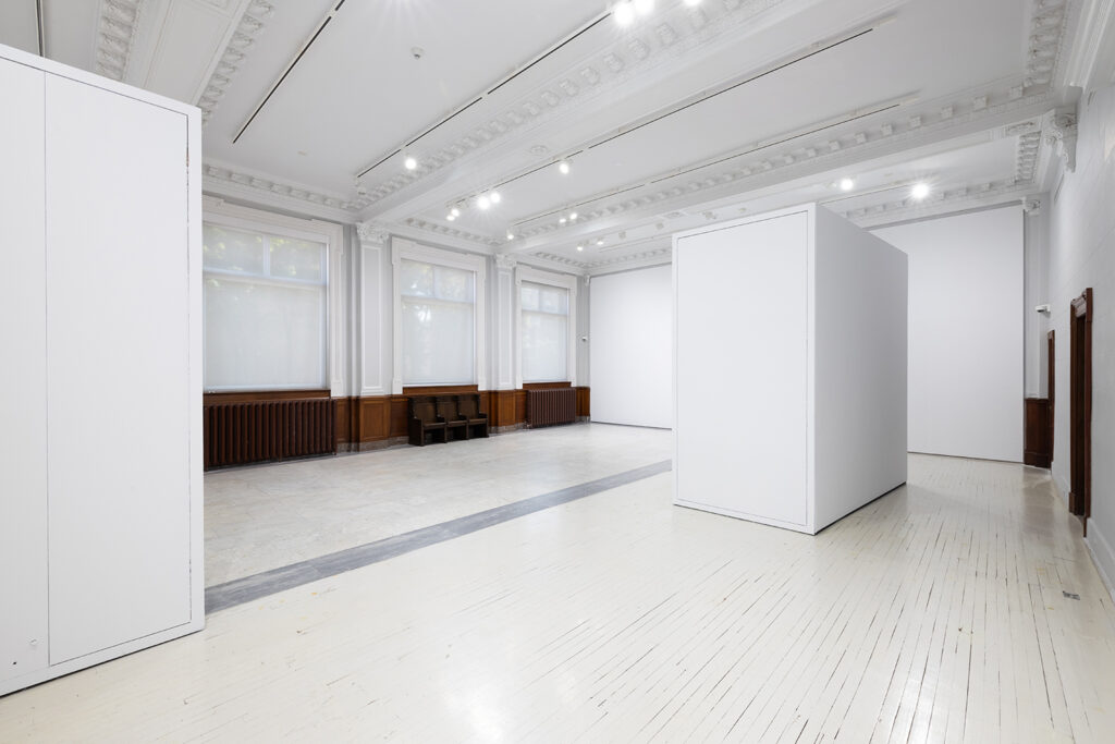 Conçus par la firme _naturehumaine, les modules mobiles dans la salle d’exposition principale sont uniques à la Fondation. Agissant à la fois comme surface d’accrochage pour les œuvres, d’espaces de rangement et d’entreposage pour les plus grands tableaux de la collection, les modules ont éliminé la production de murs temporaires pour la production d’expositions. Leur flexibilité permet également de modifier la configuration de la salle d’une exposition à l’autre sans produire du mobilier à usage unique. Ces volumes géométriques ont été inspirés par des œuvres de Molinari.